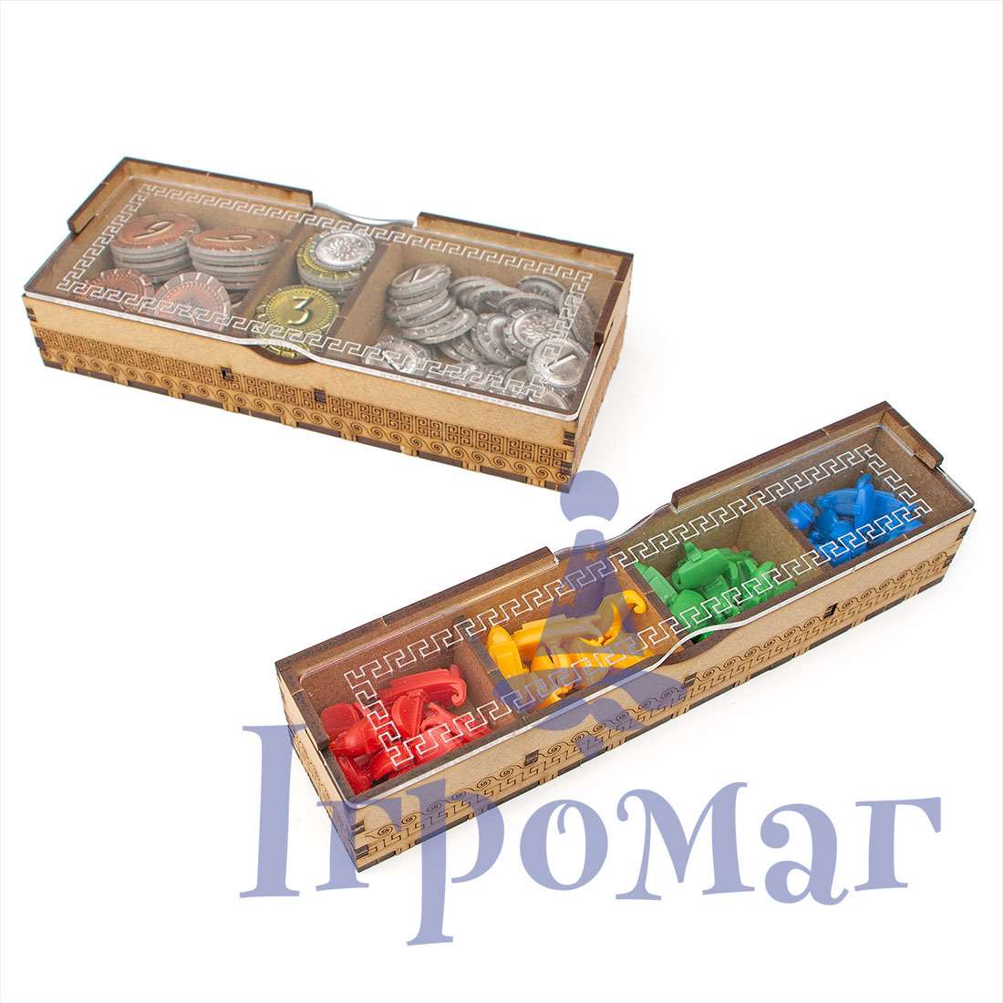 Каждый из лотков украшен красивым орнаментом и закрыт оргстеклом. Все лотки помечены символами токенов, жетонов и миниатюр, чтобы подготовка к игре а также сбор компонентов обратно в коробку превращались в легко прогулку, а не нудную сортировку компонентов.