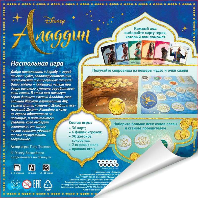 В настольной игре Аладдин вам предстоит заручиться поддержкой известных персонажей истории, чтобы достичь славы во дворце падишаха Аграбы. Вам предстоит плести интриги и предугадывать шаги своих соперников с помощью всего лишь шести карт персонажей.