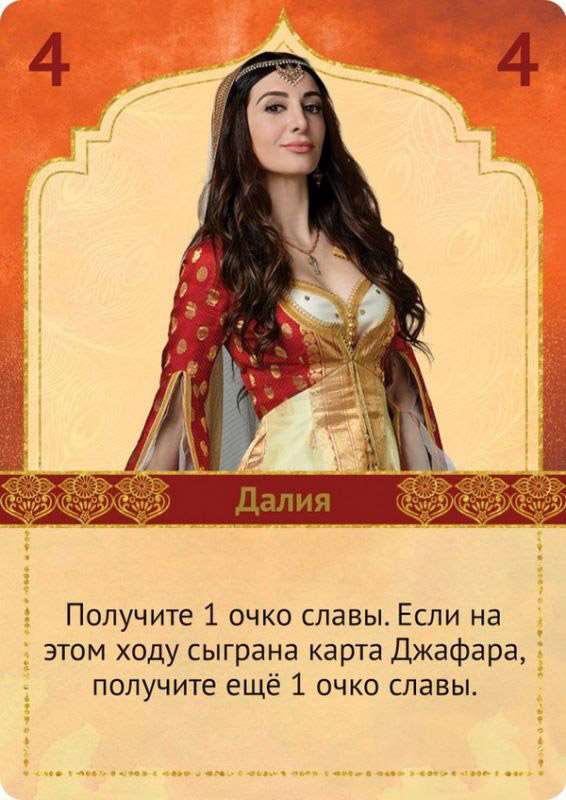 Далия – подруга Жасмин, которая знает, как извлечь пользу из интриг против Джафара. Она позволяет получить очки славы за каждую разыгранную в этом ходу карту визиря.