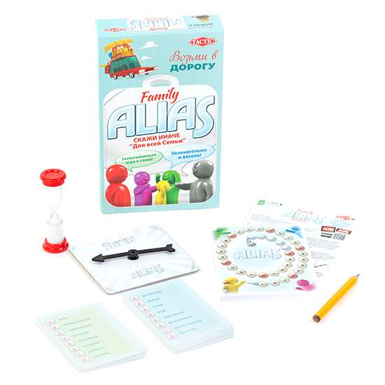 Комплектация настольной игры «Алиас Семейный. Дорожная версия»:- 30 двусторонних карточек для всей семьи
