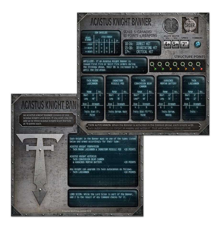 Для каждого баннера Имперских Рыцарей Акастус, который вы выставляете на поле, необходим Командный Терминал Баннера Рыцарей Акастус (Acastus Knight Banner Command Terminals). Терминал предоставляет детализированную поверхность, на которой можно отслеживать состояние отряда: статус, повреждения, вооружение Рыцарей, а также приказы, которые вы им даёте на каждый ход. Этот набор содержит пять широкоформатных планшетов командных терминалов, которых хватает, чтобы добавить несколько баннеров рыцарей Акастус в игры Adeptus Titanicus.