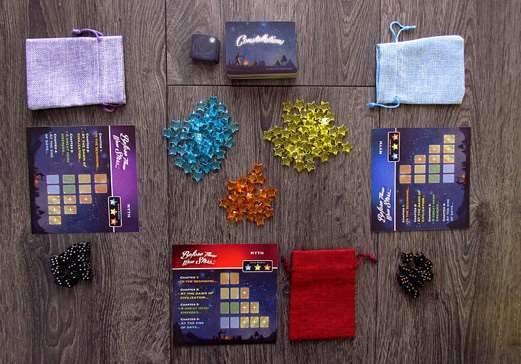 В начале партии игроки получают планшеты, кубики, мешочки и звезды для оценивая. На стол выкладываются доступные карты созвездий.