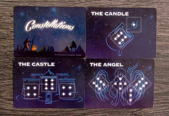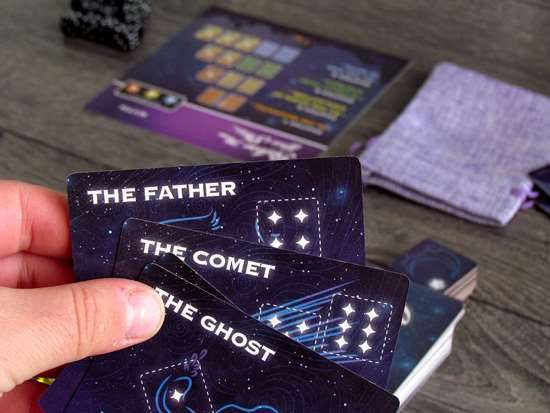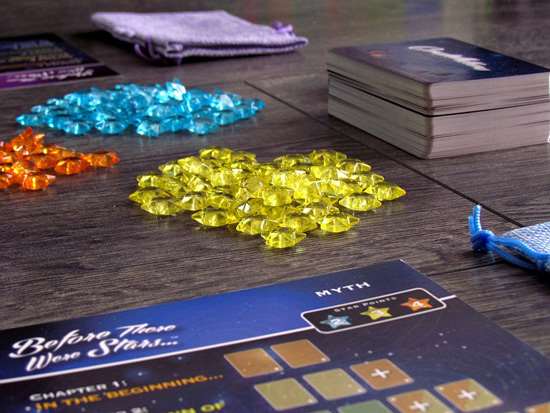 Для создания главы игрок обязан бросить кубики и заплатить выпавшими на них значениями, чтобы взять со стола карты созвездий. Каждое созвездие – это слово или словосочетание, которое должно обязательно появиться в будущей истории игрока.