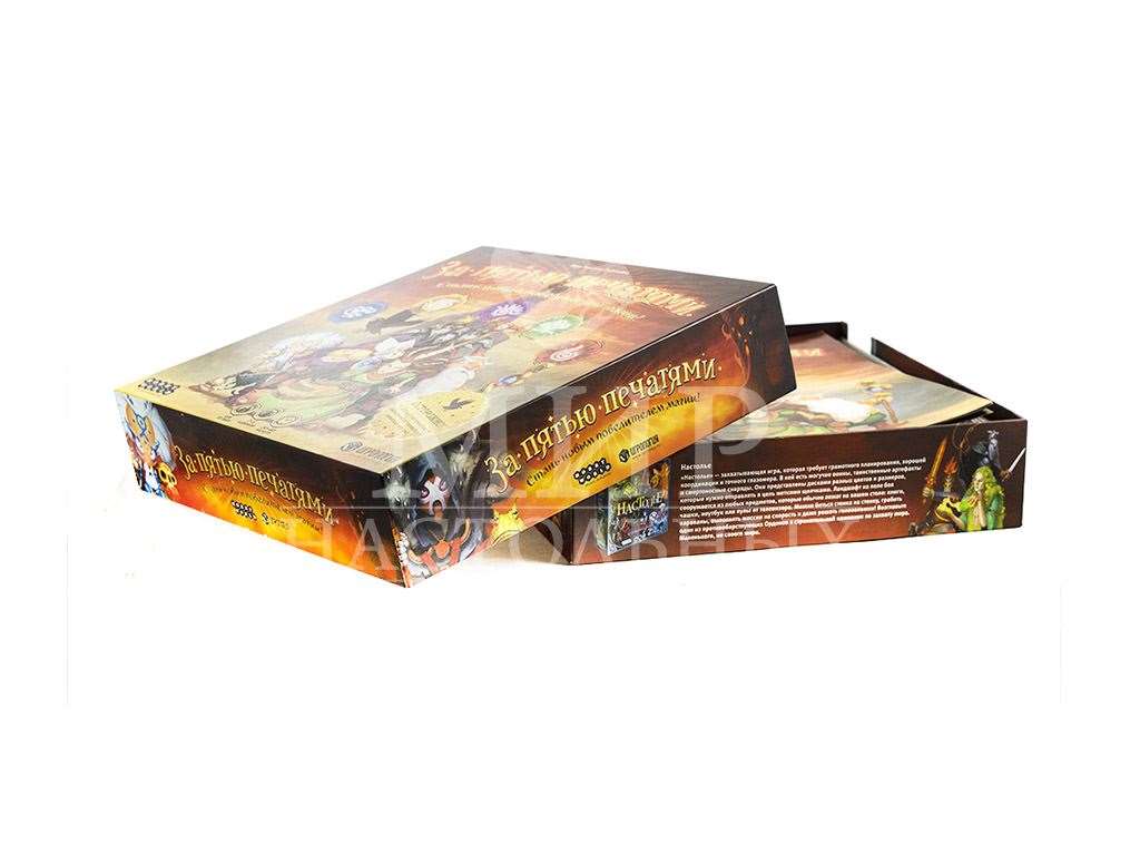 В настольной игре За пятью печатями игроки выступают в роли магов, путешествующих по заколдованной башне в поисках магических свитков. Задача осложняется тем, что все проходы и сами свитки оберегают защитные заклинания. К тому же оппоненты никогда не упустят шанс сделать пакость, разместив на дороге одного из своих фамильяров или отдав приказ стражу башни. Для того чтобы пройти в дверь или выучить новое волшебство, вам придется сломать печати, выбросив определенное значение на комбинации цветных кубиков, соответствующих природным стихиям. Чем дальше вы продвигаетесь, тем сложнее печати и коварнее оппоненты, но тем шире ваш собственный арсенал и ценней награда!