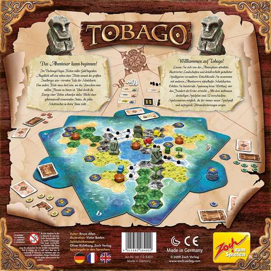 Дуже красива і тактильно приємна гра! Компоненти тут бомбезні, чого тільки кам'яні ідоли варті! "Тобаго" по компонентам повністю мовонезалежна, правила доступні для ознайомлення, тому з легкістю можна грати в іноземне видання. Сам ігролад цікавий і трохи незвичний, адже ви самі, завдяки картам, звужуєте коло пошуку скарбів. При цьому, недостатньо просто взяти участь у розкопці, потрібно ще й якнайшвидше приїхати до місця розкопки. А скарби - це не лише золото, вони можуть і прокляття з собою нести. В процесі відкриття карт скарбів дуже азартно та весело, при цьому гра неважка і вкладається у зазначений час від 45 до 90 хв. Грати найцікавіше на 4х. Класна сімейка :)