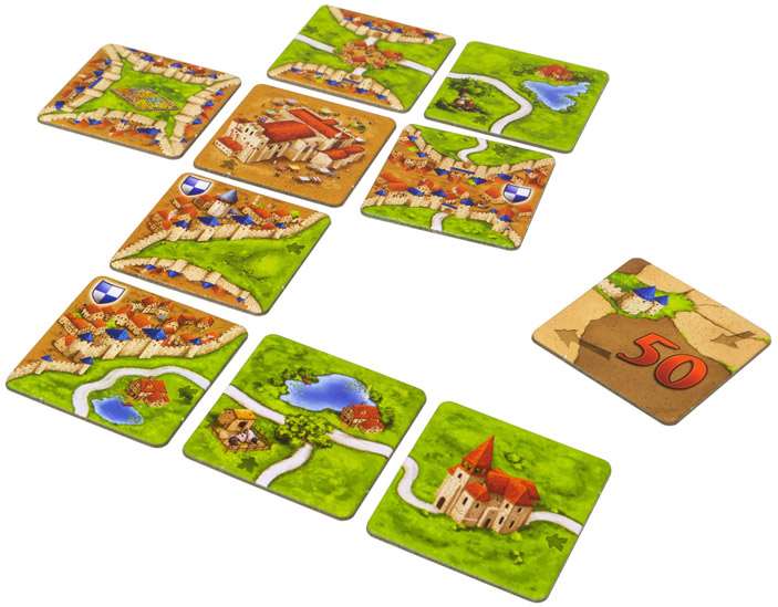 И конечно же, теперь вам доступны новые земли. Это 8 абсолютно новых плиток земель: 6 с придорожными тавернами и 2 с соборами. Если на дороге с таверной стоит вор, то за каждый ее сегмент вы получите по 2 очка. А если город с собором охраняет ваш рыцарь, то за каждый его квартал и щит вы заработаете по 3 победных очка. Но будьте осторожны, если эти территории не будут завершены к концу игры, то вы вообще ничего за них не получите. Эти земли добавляют в игру элемент риска, что делает ее более азартной и напряженной. Кроме этого расширение содержит 10 земель, состоящих из новых конфигураций элементов базовой игры. Так же теперь вы сможете упростить учет победных очков при помощи удобных жетонов 50/100. Просто давайте такой жетон каждому игроку, чей подданный пересек стартовую черту на шкале подсчета очков. Если он снова пройдет всю дистанцию, то переверните жетон другой стороной.