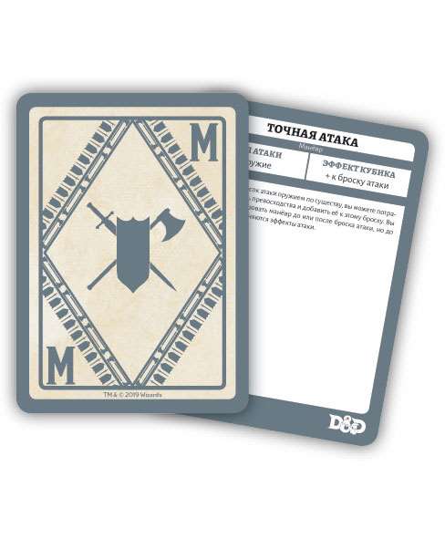 Набор Dungeons & Dragons. Карты заклинаний. Способности бойцов и рас содержит карты с описаниями не магических способностей таких боевых классов как воин, монах и варвар. Среди них вы найдете всевозможные боевые техники, навыки, тактики и приемы.
