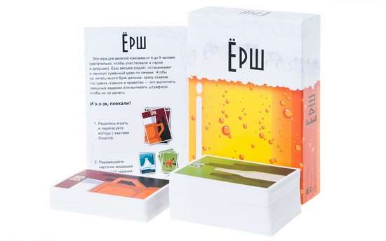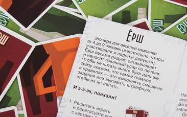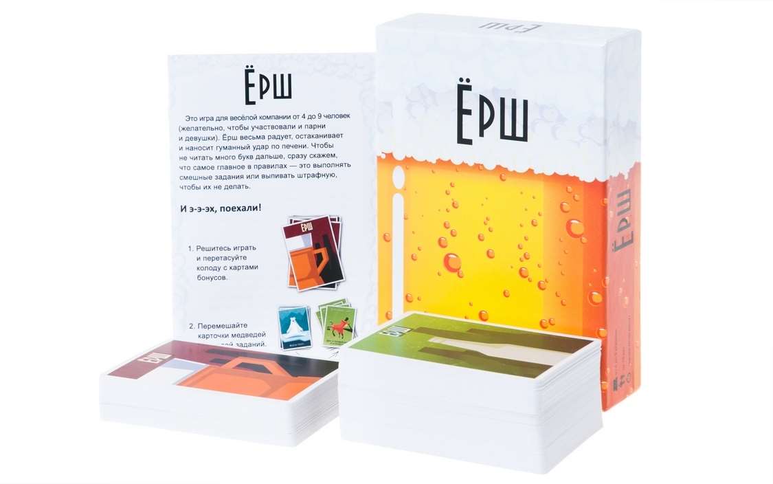 Настольная игра Ёрш позволит вам разнообразить любое застолье, превратив беспорядочное употребление напитков и салата оливье в веселую застольную игру. Участники по очереди должны будут тянуть карты и выполнять забавные задания и, в случае удачи, получать призовые карточки. Последние позволяют затем подкинуть какую-нибудь пакость оппонентам. Помимо этого выполненное задание приносит победные очки. Еще иногда приходит белый медведь, от которого стоит коллективно прятаться под стол. А что же происходит, если игрок отказывается или не может выполнить задание? Все просто: в этом случае ему придется начислить штрафную. Конечно, наличие алкоголя за столом придает игре особую пикантность, но вы можете играть в Ерша используя абсолютно любые напитки. Главное придерживаться правил и получать от игрового процесса максимум удовольствия.