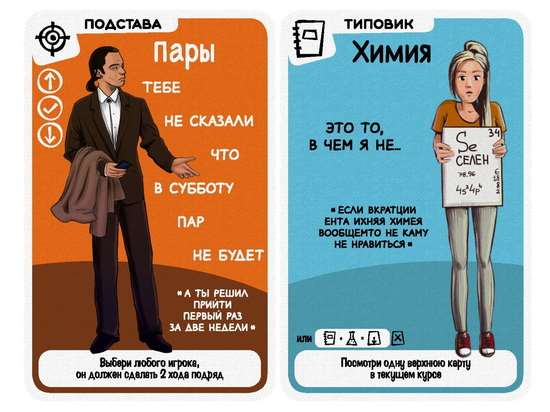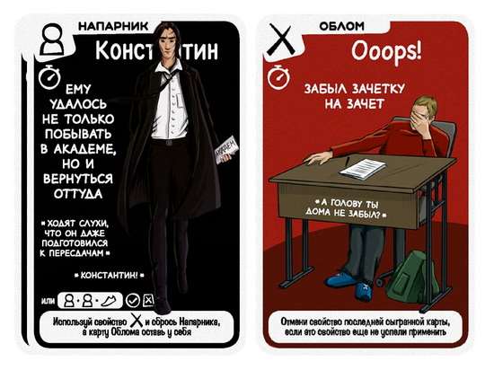 Если открытая карта не «Отчисление», то игрок просто забирает её себе. А вот если студент вытащил «Отчислен», то придется потянуть верхнюю карту сброса и выложить её перед собой. А саму вытащенную карту замешать в колоду следующего курса.