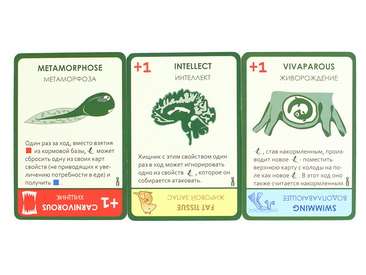 - Метаморфоза. Животное с этим свойством во время своей фазы питания, вместо взятия фишки пищи из основной кормовой базы, может сбросить одну из своих карт свойств и получить пищу из дополнительной кормовой базы. Естественно, при этом нельзя скидывать увеличивающие прожорливость свойства. Применив этот нехитрый прием вы можете выжить, даже если вся пища в текущем раунде уже была съедена.