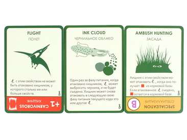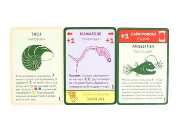 Интеллект. Хищник с этим свойством один раз в ход может игнорировать одно из свойств атакуемого им животного. С этого момента ни одно животное на игровом столе не может чувствовать себя в полной безопасности.Удильщик. Самая необычная карта в дополнении, добавляющая в игру элемент блефа. Теперь нападающий на ваших с виду безобидных животных хищник, может сам стать жертвой, попав в пасть к удильщику. Эту карту можно сыграть только как животное. Когда хищник атакует ваше животное, на котором нет свойств, удильщик сможет вне очереди атаковать напавшего хищника, игнорируя одно из его свойств. Однако при этом удильщик также не должен иметь каких-либо свойств.