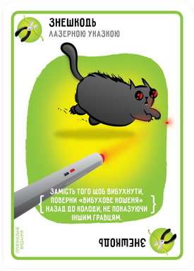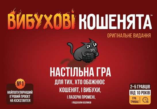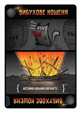 Вибухові кошенята (Exploding kittens) – украинская версия невероятно популярной игры на выбывание. Игрокам предстоит сыграть в кошачью «русскую рулетку», вытягивая карту за картой из общей колоды и постараться не стать жертвой котенка с бомбой.