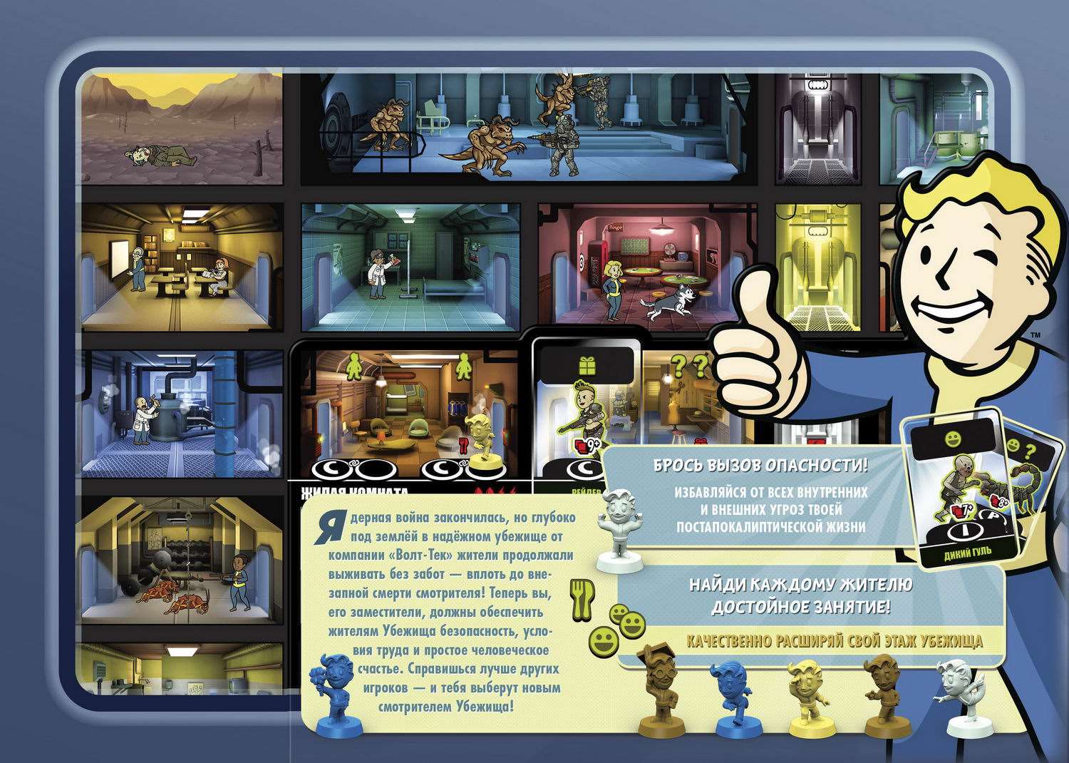 Fallout Shelter – настольная игра, в которой участникам придется взять на себя роль не вовремя почившего Смотрителя убежища, чтобы удовлетворить все запросы его обитателей. Тот, кто сможет наиболее высоко поднять уровень счастья жителей, станет победителем, получив должность следующего Смотрителя.