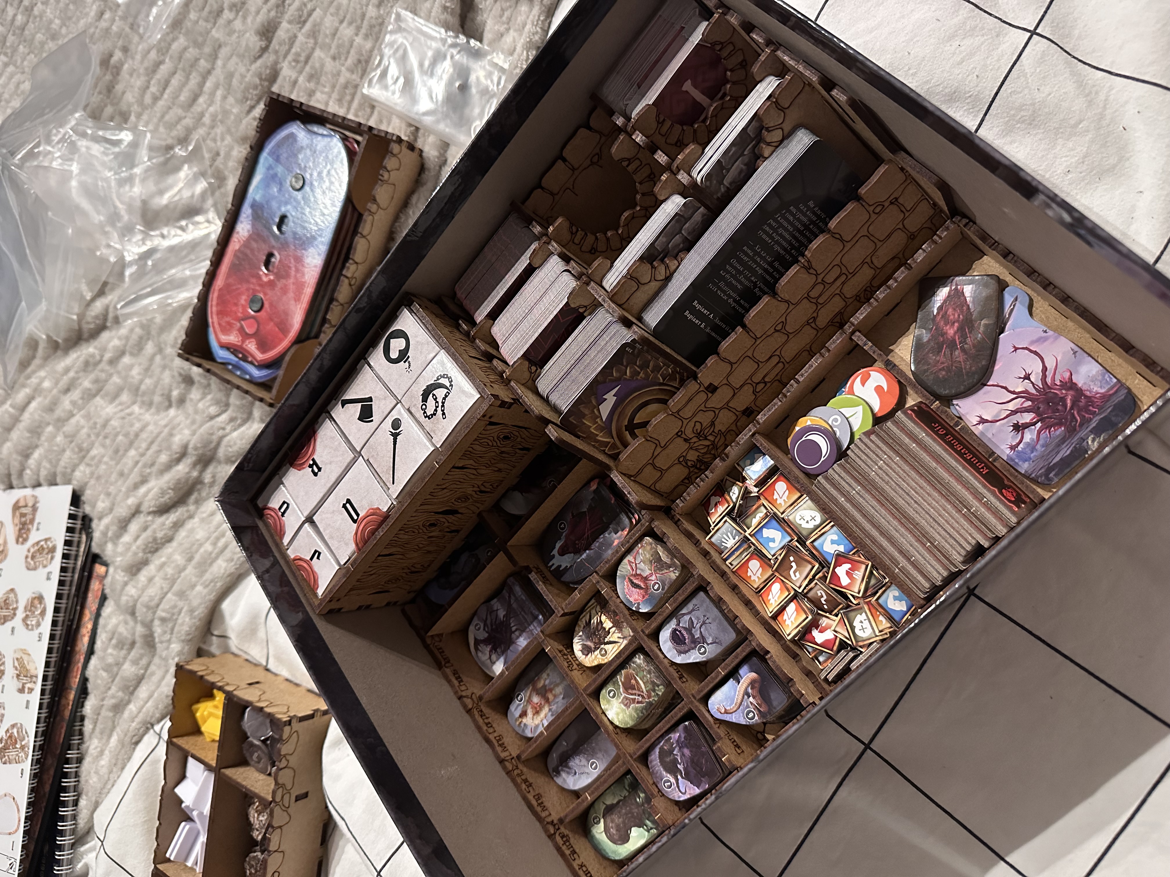На жаль, дуже розчарований у порівняні з іншими органайзерами від TowerRex Розвалюється постійно при діставанні його з коробки, від маленького натискання теж відпадає, як от взяття якогось жетону. Також трохи не зручна організація місця під різні жетони, як он жетони рани разом з фігурками моснтрів. Займає багато місця, а користуєшся лишень двома секціями. Інші монстри зазвичай у партії не потрібні.