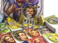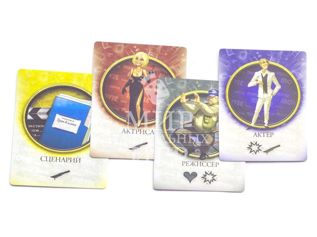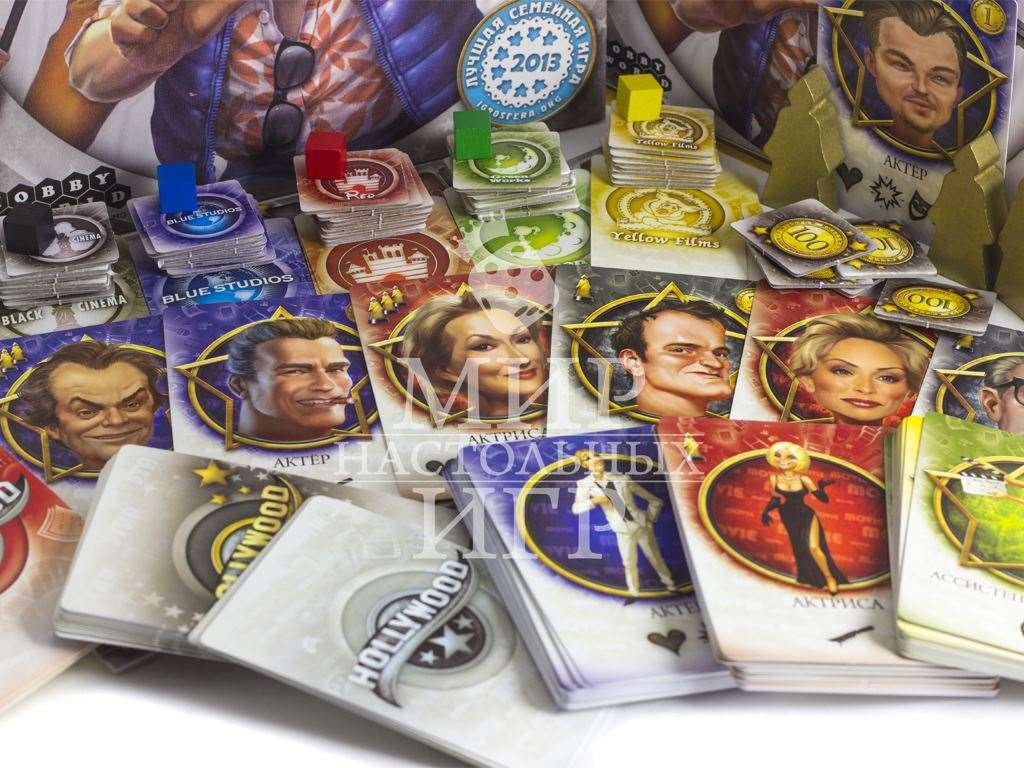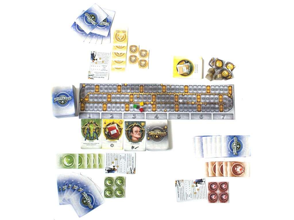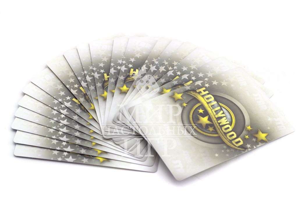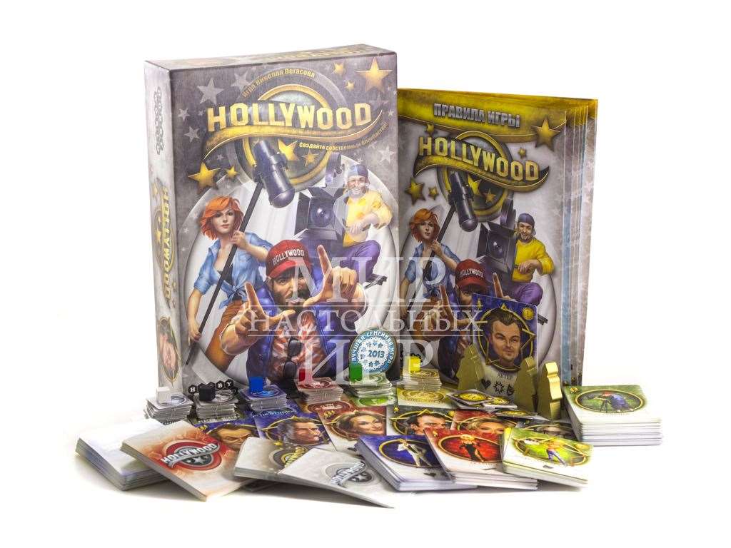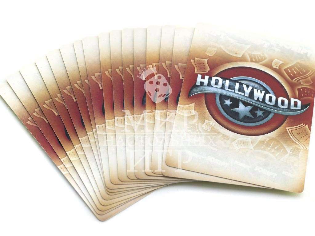 Настольная игра Hollywood (Голливуд) позволит игрокам побывать в роли хозяев киностудий. Покупая сценарии, нанимая актеров и формируя съемочную группу, вы создадите за игру минимум три шедевра кинематографа. В вашем подчинении будут режиссеры и звукооператоры, менеджеры и гримеры, костюмеры и агенты. Каждый раунд игроки будут выбирать карты, передавая их по кругу и оставляя себе по одной карте. Кроме этого во время аукциона вы сможете заполучить звездных актеров и актрис, в юморных карикатурах которых вы легко узнаете реальные голливудские прототипы. Каждый снятый фильм помимо кассовых сборов может принести также оскары, которые сыграют важную роль при определении победителя в игре.Содержание настольной игры Hollywood (Голливуд):