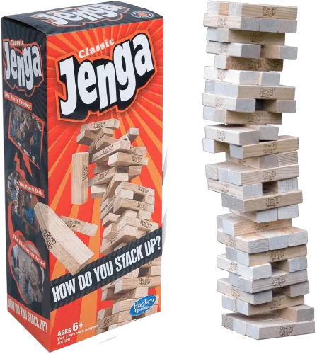 Тип: Игра на координацию для веселой компании Издатель: Hasbro (США) Время игры: от 20 до 40 минут Кол-во игроков: от 1 игрока Возраст: от 6 Язык: языконезависимая Ознакомиться с правилами можно здесь Содержание настольной игры Jenga Classic (Дженга Классическая): - 54 деревянных бруска - Правила игры
