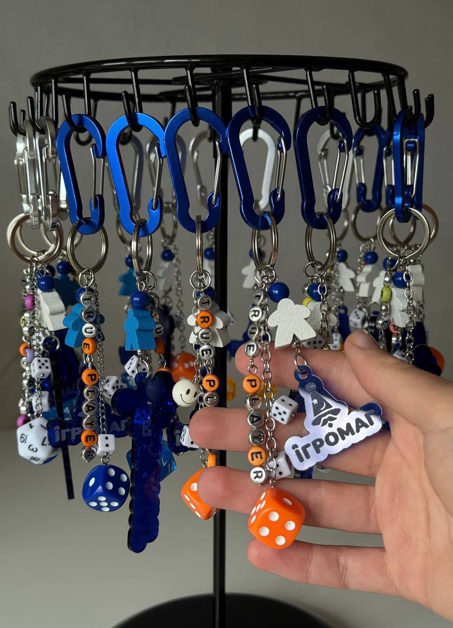 Этот яркий брелок ручной работы состоит из классических игральных кубиков, миплов, разноцветных бусин, акрилового элемента с логотипом «Игромага» и узнаваемым волшебником, а также карабином, позволяющим украсить связку ключей, любимый рюкзак или же наш фирмовый шопер.