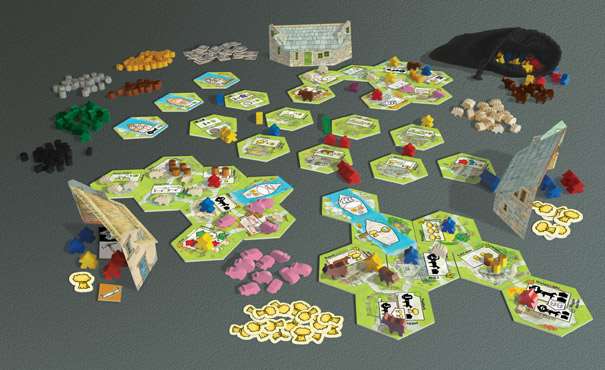 это пастбища и три типа животных, которые могут там пастись. Пастбища – это лужайки на территории вашего поселения, ограниченные дорогами и строениями. На каждом отдельном луге могут пастись животные только одного типа: коровы, свиньи или овцы. Причем победные очки вы будете получать именно за пастбища, а не за количество присутсвующего там скота.