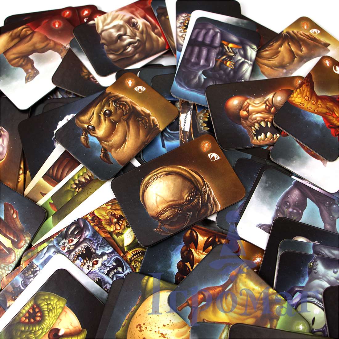 Комплектация настольной игры «Кошмариум. Расширенное издание.»: - 108 карт страхов — частей монстров;