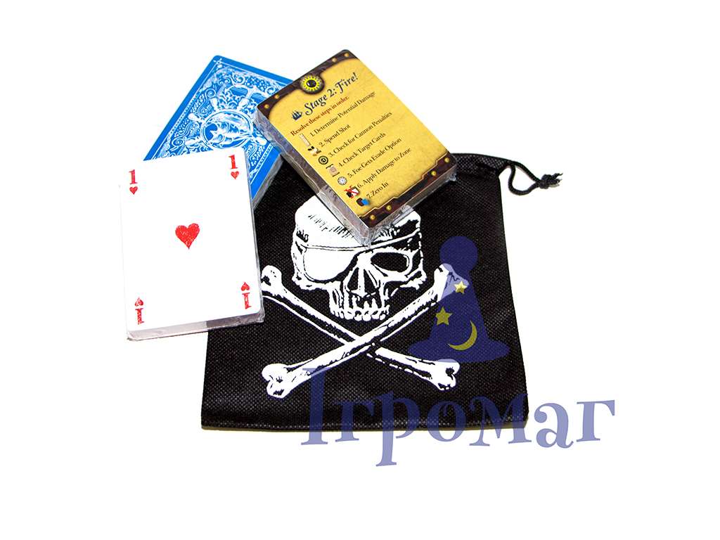 персональный планшет, на котором изображен его корабль, а слева сбоку перечислены действия, которые можно выполнять на протяжении игрового раунда. На корабле нарисованы специальные ячейки - на парусах, палубе и корпусе. На эти ячейки выкладываются деревянные жетоны, символизирующие пиратов, паруса и прочность корабля.