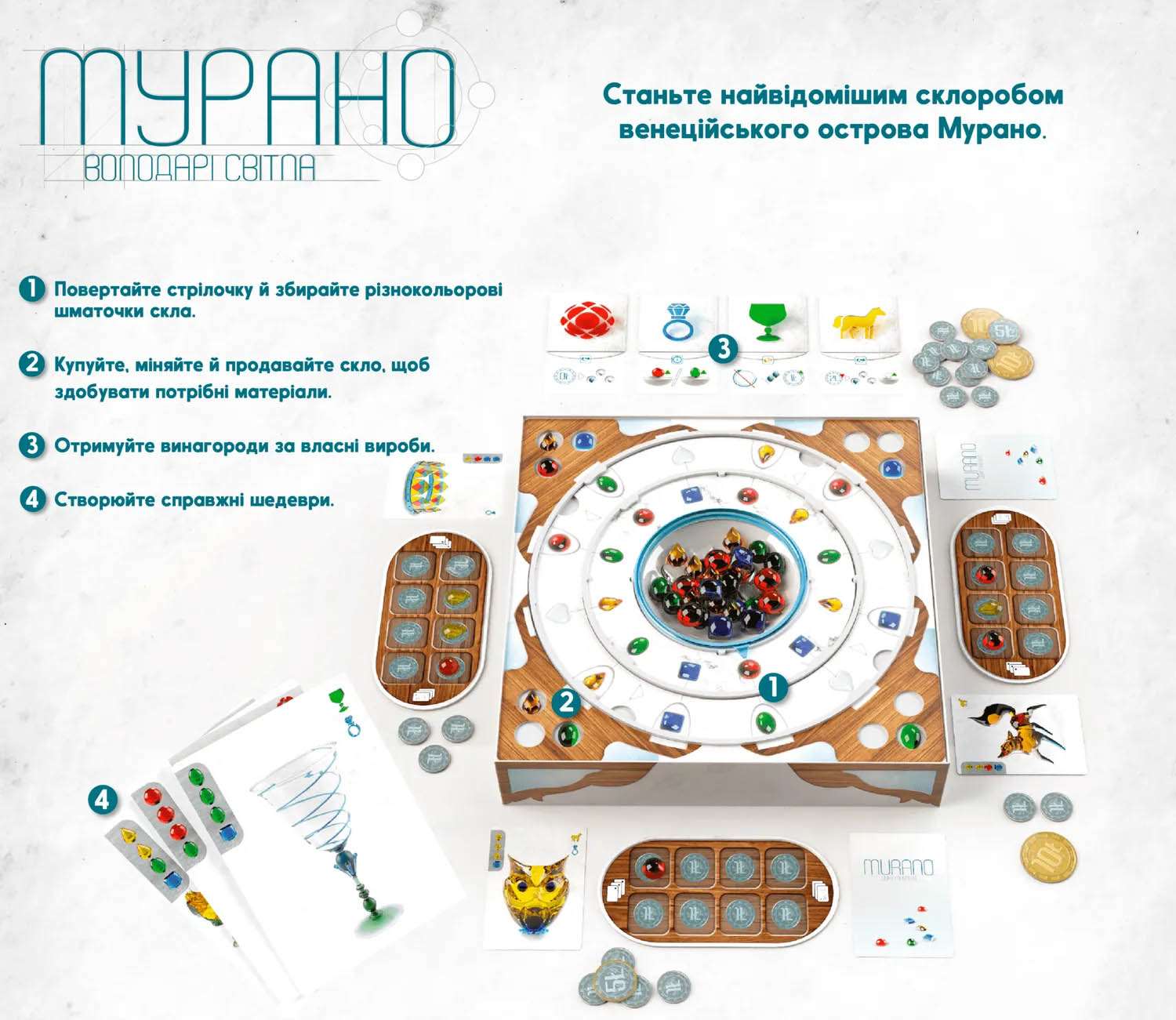 "Мурано: Володарі світла" – це прекрасна абстрактна стратегія, яка перенесе вас на однойменний острів Венеційської лагуни. Тут ви станете майстром склодува, створюючи вишукані вироби зі скла. Гра приваблює чудовим оформленям, де є красиві різнокольорові шматочки скла та доволі цікаве та незвичне поле ринку, що обертається. Правила прості, проте гра пропонує багато можливостей для стратегічного мислення. Вам доведеться планувати свої ходи, щоб отримати найцінніші ресурси та створити найвишуканіші вироби, та задовільнити ваших найвибагливіших клієнтів.