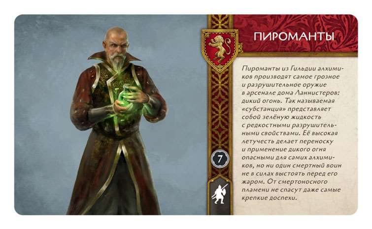 В недрах подземелий Королевской Гавани хранятся десятки тысяч сосудов с жидкостью, известной как «дикий огонь». Таинственный орден пиромантов годами работает над усовершенствованием субстанции и верой и правдой служит дому Ланнистеров. Будучи включенными в отряд армии под знаменем Льва, пироманты не обладают какой либо защитой, зато их атаки на ближнем расстоянии наносят колоссальный урон и вносят панику и сумятицу в ряды врага.