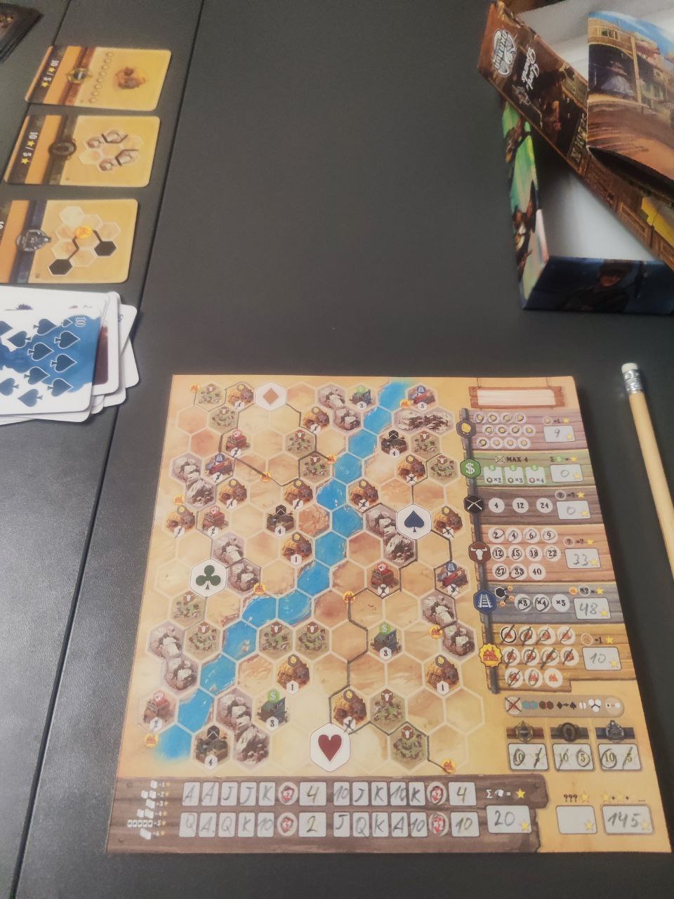 Тетяна (01-05-2024 | 11:35)Це чудова flip-and-write гра, яка переносить вас на Дикий Захід, де ви стаєте магнатами залізниць. Замість класичного будівництва маршрутів, як у Ticket to Ride, тут механіка побудована на покерній колоді: дилер відкриває карти, обирає одну для себе, а решта гравців по черзі беруть з відкритих. Кожна карта дозволяє малювати залізничні колії на особистому планшеті, з'єднувати міста, захоплювати ранчо, банки, салуни чи золоті копальні.