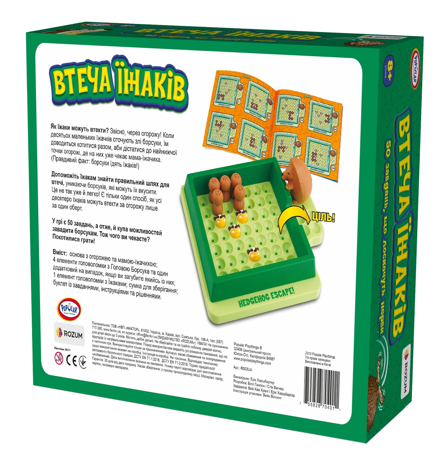 Побег Ёжиков (Hedgehog Escape) — это трехмерная соло-игра, в которую можно играть командой, разгадывая задания вместе. Игра тренирует логическое и пространственное мышление и развивает мелкую моторику через тактильное и визуальное восприятие компонентов игры. Буклет игры содержит 50 заданий различной сложности. Для самых сложных задач может понадобиться помощь всей семьи!