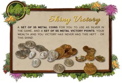 - Аксессуар Металлические Монеты — это 35 металлических монет, выполненных под настоящее серебро, и 55 бронзовых токенов, которые помогут вести счет победных баллов. Выглядят как настоящие, хоть в копилку кладите!