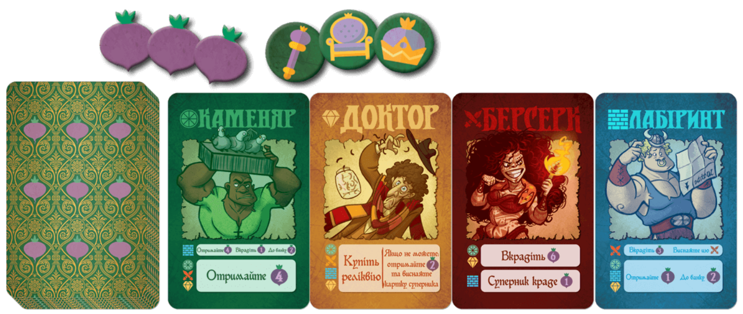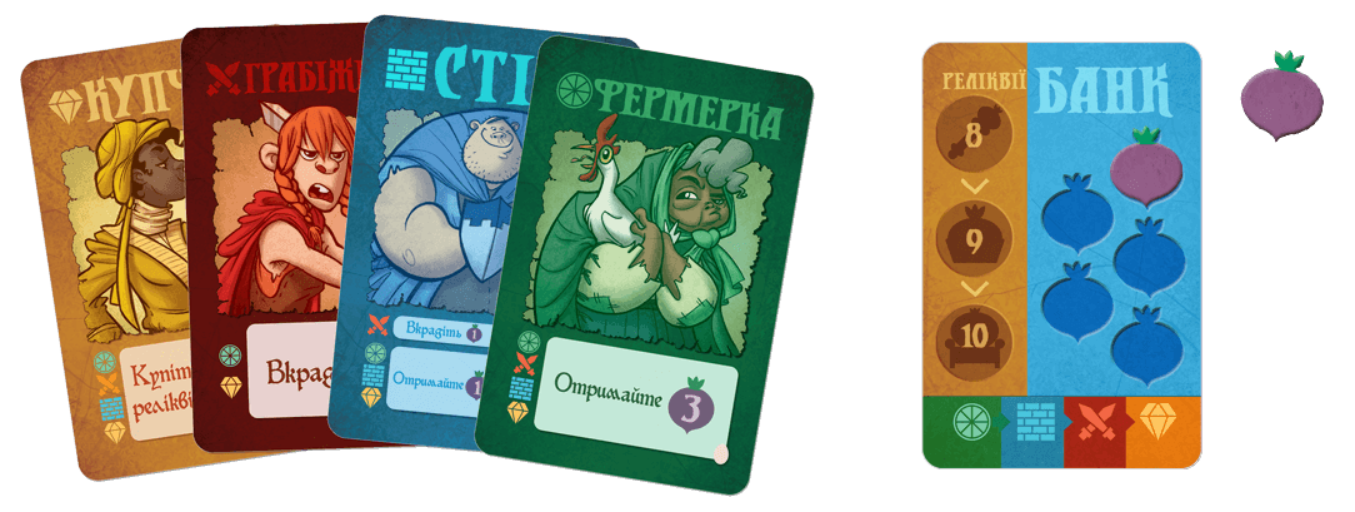 Как только игрок собирает три реликвии, он или она выигрывает, а игра заканчивается. Если несколько игроков покупают свою третью реликвию одновременно, выигрывает игрок, у которого останется больше репы. Давайте завоевывать звание самого умелого купца!Комплектация настольной игры «Купуй Грабуй (UA)» (Village Pillage):