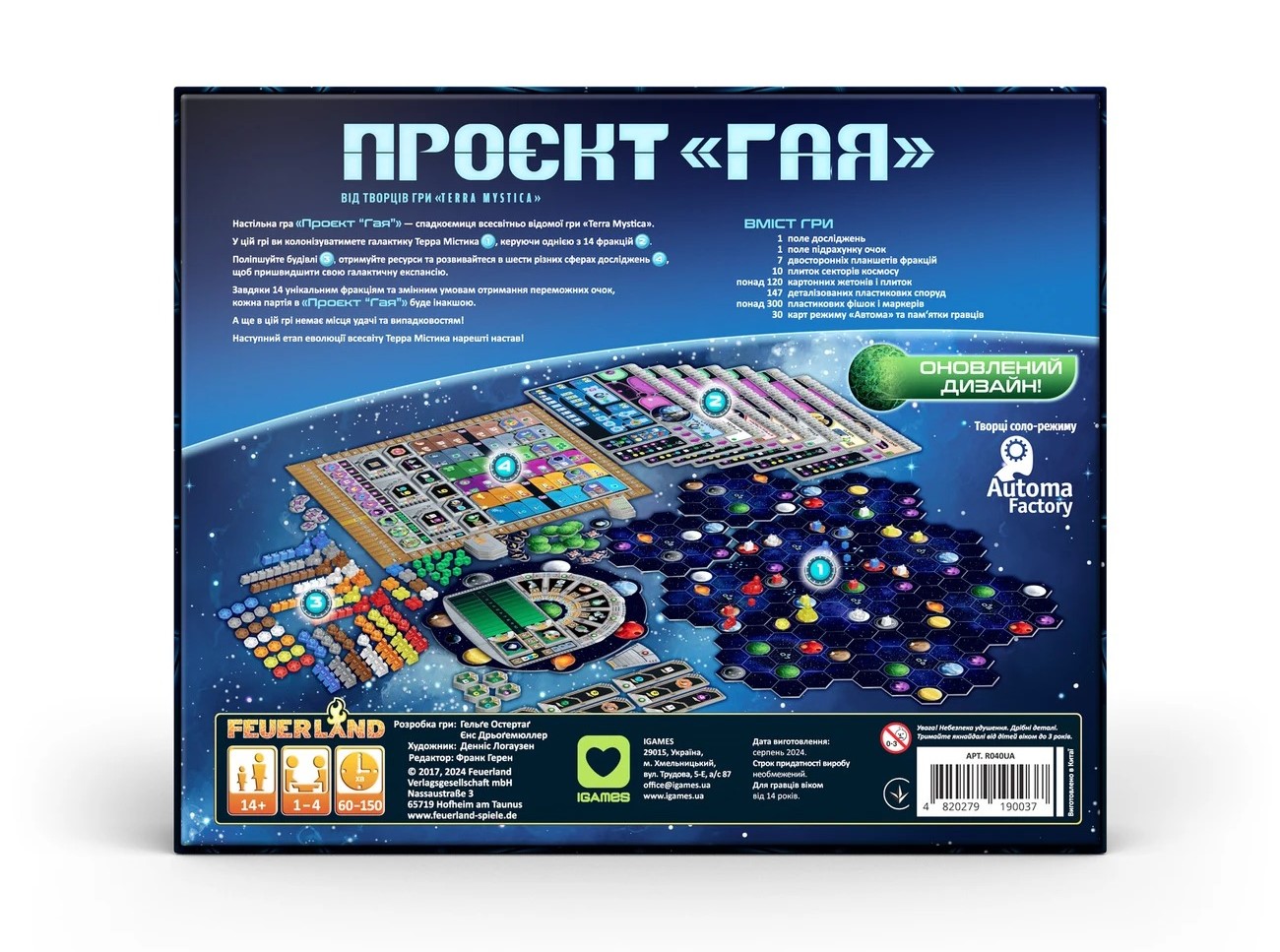 Проект «Гайя» (Gaia Project) — это стратегическая игра на развитие цивилизации в космосе. Она рассчитана на 1-4 игроков от 12 лет. Время партии — 60-150 минут.