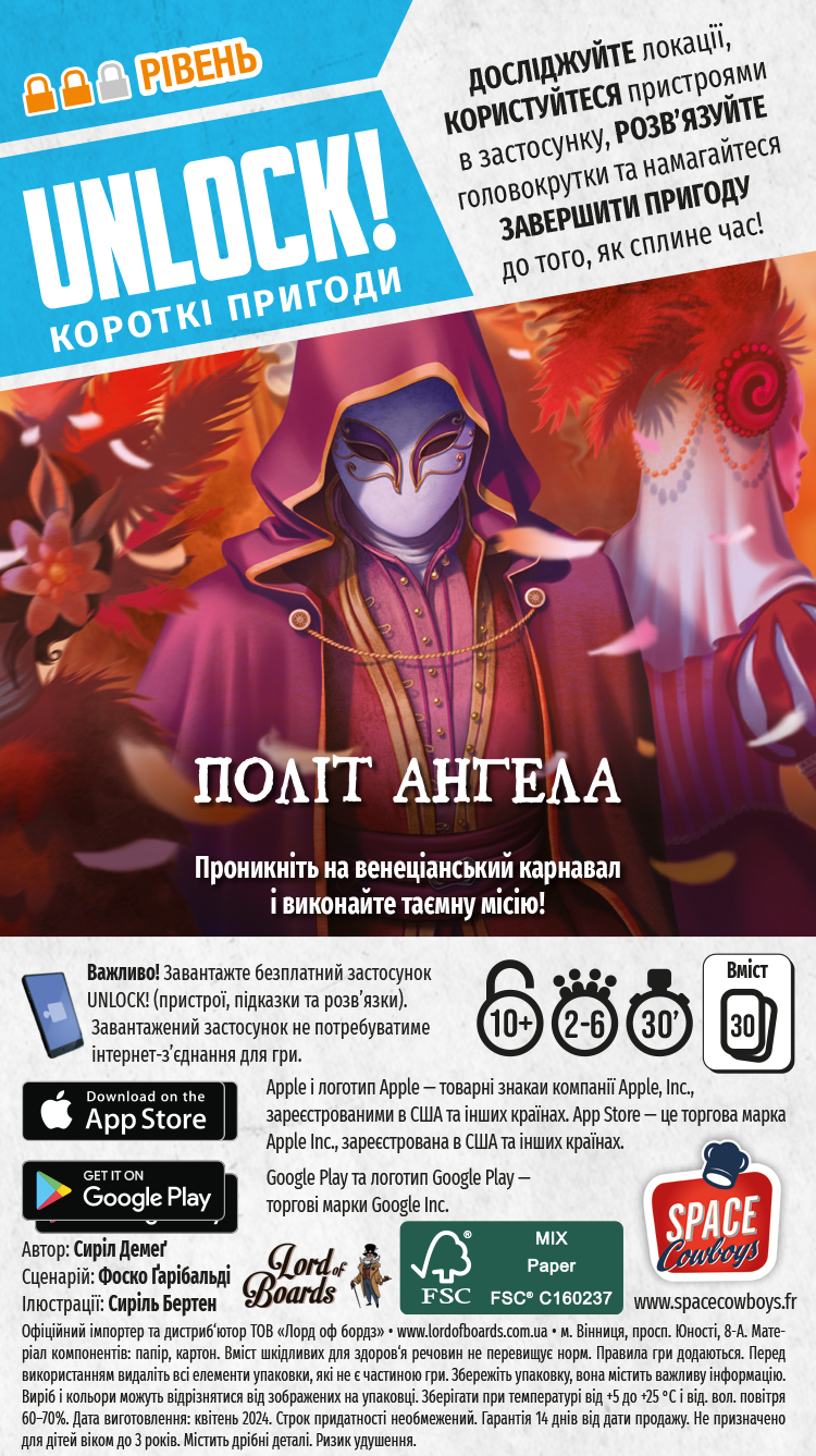 Unlock! Короткие приключения. Полет ангела (Unlock!: Short Adventures – The Flight of the Angel) — это кооперативная настольная игра, которая удачно сочетает в себе атмосферу мистического приключения с элементами детективного квеста. Отправляйтесь в мир загадок, интриг и головоломок, где каждый шаг имеет свои последствия, а опасность скрывается за причудливыми масками! Игра подойдет для любой компании игроков, которые любят разгадывать интересные головоломки и выполнять интерактивные задания. Короткий формат партий обеспечивает динамичный и азартный геймплей, который не надоедает.