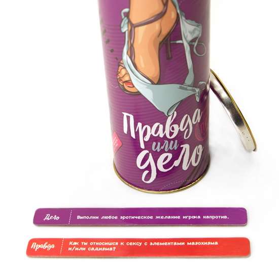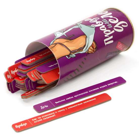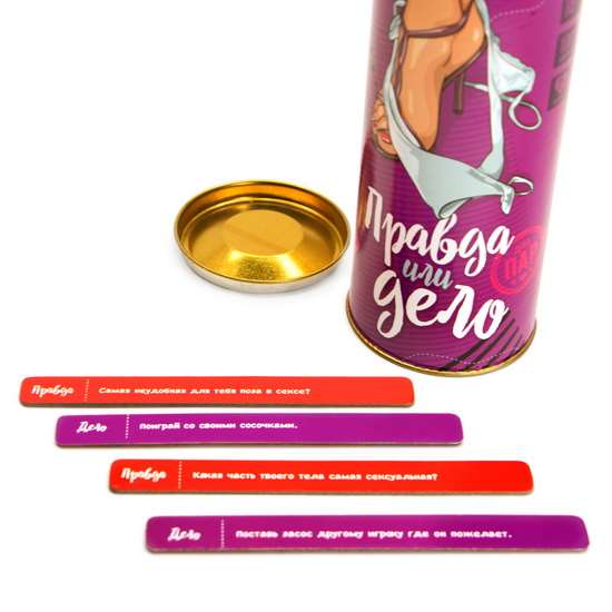 ПРАВДИВО на него ответить. В случае если игрок выбирает «дело» - он тянет случайную карточку с описанием некого действия, которое он обязан выполнить. По правилам, участник дважды может отказаться отвечать на вопрос или выполнять действие, однако за последующие отказы последует штраф, который придумает второй игрок!