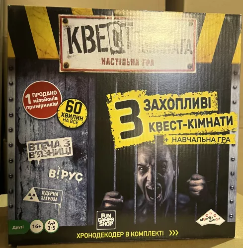 «Квест кімната» - настільна гра (Escape Room: The Game) – це унікальна кооперативна логічна гра для 3-5 сміливців, яка перенесе вас у серце загадкової кімнати, з якої можна вибратись лише шляхом розв’язання всіх хитромудрих задач й отримання кодів до Хроно Декодера – пристрою, який веде відлік часу, перевіряє істинність ваших суджень та надає підказки. Коробка з грою містить 3 цілком різних історії, втім головна мета для всіх єдина – підібрати 3 секретних коди для Декодера протягом 60 хвилин та вирватися з пастки.