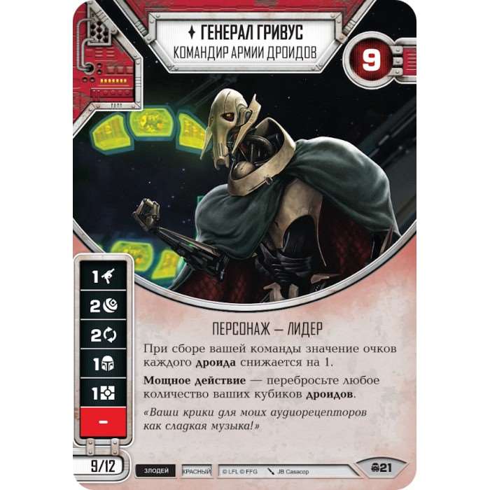 Стратегия колоды Star Wars. Destiny: Генерал Гривус (Стартовый сет) вертится вокруг взаимодействий ваших механизированных войск. Действия дройдов Коммандо позволяют активировать армии дройдов, а сам генерал Гривус мастерски способен управлять ими – перекидывая кубы и удешевляя стоимость активаций.