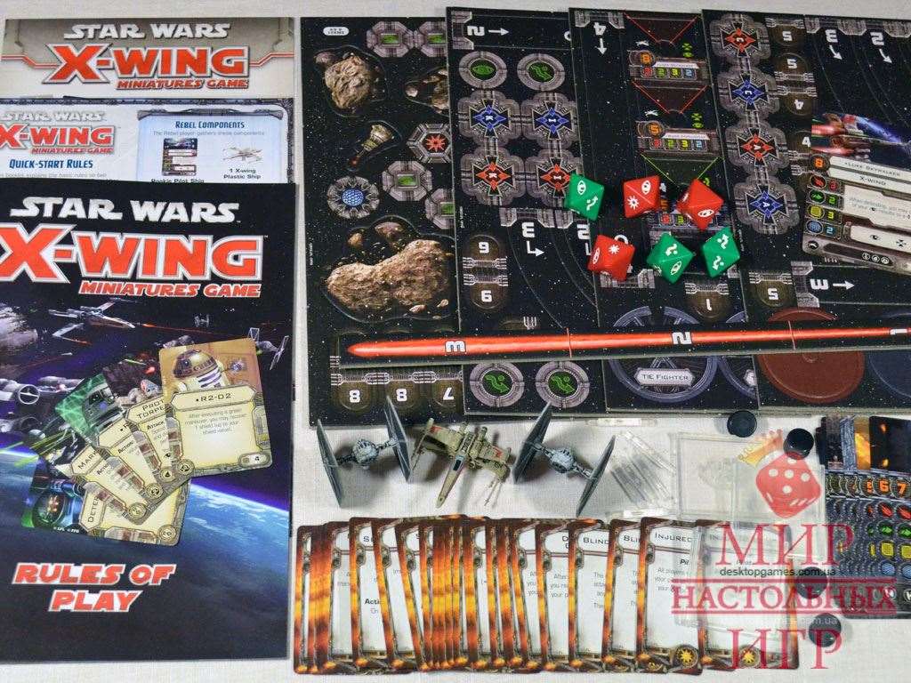 В настольной игре Star Wars: X-Wing (Звёздные Войны: X-Wing) участники вступят в звездные сражения, взяв под контроль один или несколько космических истребителей, знакомых многим по знаменитой серии художественных фильмов. Один из игроков возглавит силы империи, второй выступит на стороне повстанцев. Каждый корабль в игре представлен пластиковой миниатюрой на подставке, картой характеристик и набором улучшений. Каждый ход вы будете выбирать один из доступных кораблю маневров и пытаться поразить корабли противника, если таковые окажутся в вашей области видимости. Для перемещений в игре используются линейки-шаблоны, а сражения разыгрываются при помощи бросков кубиков. Игровая механика предоставляет вам широкие возможности: вы можете сразиться в одном из специально разработанных сценариев или создать свой собственный отряд. В будущем вы можете расширить эскадру, приобретя дополнительные корабли.Подготовка к игре может занять немного времени. В зависимости от выбранного типа сражения, вы можете либо самостоятельно построить свои звенья на оговоренное количество очков, либо разложить один из сценариев. В первом случае вы можете выбирать любого входящего в комплект пилота, а также доступные ему улучшения. Во втором случае необходимо следовать приведенным в конце книги правил сценариям. Например, вы можете сопровождать поврежденный дипломатический шатл или защищать от врага системы коммуникаций. В любом случае, каждый из игроков получает выбранные корабли, размещая их со своей стороны игрового стола.Несмотря на комплексные правила, игровой процесс в Star Wars: X-Wing прост, интуитивно понятен и во многом напоминает популярную военную игру Wings of War. Все сражение разбито на раунды, в начале каждого из которых игроки тайно выбирают маневр для подконтрольных им кораблей. После того, как все маневры были выбраны, корабли начинают движение в порядке увеличения показателя умений пилота. Для этого к передней части основания подставки соответствующего корабля приставляется шаблон-линейка выбранного маневра, а затем миниатюра перемещается на ее противоположный край. Некоторые маневры позволяют выполнять более сложные действия, например мертвую петлю), но при этом корабль подвергается перегрузкам и на него накладывается ряд ограничений. После перемещения каждый корабль может выполнить по одному дополнительному действию. Набор доступных кораблю действий зависит от выбранных в начале партии пилота и улучшений. Вы можете сфокусироваться, уклониться от выстрела, выполнить специальный маневр, взять на прицел один из кораблей оппонента, отремонтировать щиты и т.д.