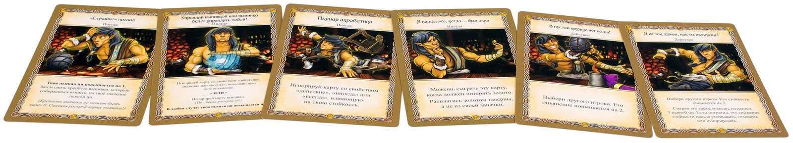 Таверны. Как обычно в коробке предлагаются четыре новых персонажа со своим уникальным набором карт, планшеты игроков, карты новых напитков и необходимые жетоны.