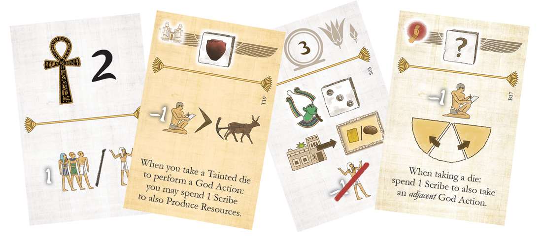 В свой ход игрок может забрать доступный кубик с центрального колеса (Запретные кубы заблочены и не могут быть взяты пока тень от обелиска не перейдет на другой сектор). После чего разместить их на свой планшет на одну из чаш весов: одна сторона предназначена для Чистых кубов, а вторая для Испорченных. При этом важно соблюдать баланс, выбирая кубы и действия, так как во время подсчета очков игроки, чьи весы смещены в «Испорченную» сторону теряют победные баллы, а сумевшие сохранить идеальный баланс награждаются бонусами.