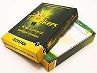 Серия настольных игр Thinkers - это набор уникальных тренажеров для вашего ума, основная задача которых не пополнить запас известных фактов и развить память, а дать необходимые умения использования логического мышления. Задания в игре построены таким образом, чтобы при их решении участники, прежде всего, пользовались цепочками логических рассуждений и причинно-следственными связями. Кроме этого игра поможет вам открыть в себе столь необходимые в наше время лидерские качества, развить творческие задатки и даст возможность научиться оперативно принимать верные решения в сжатые сроки.