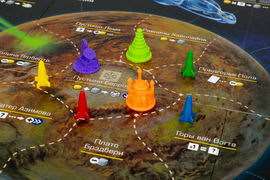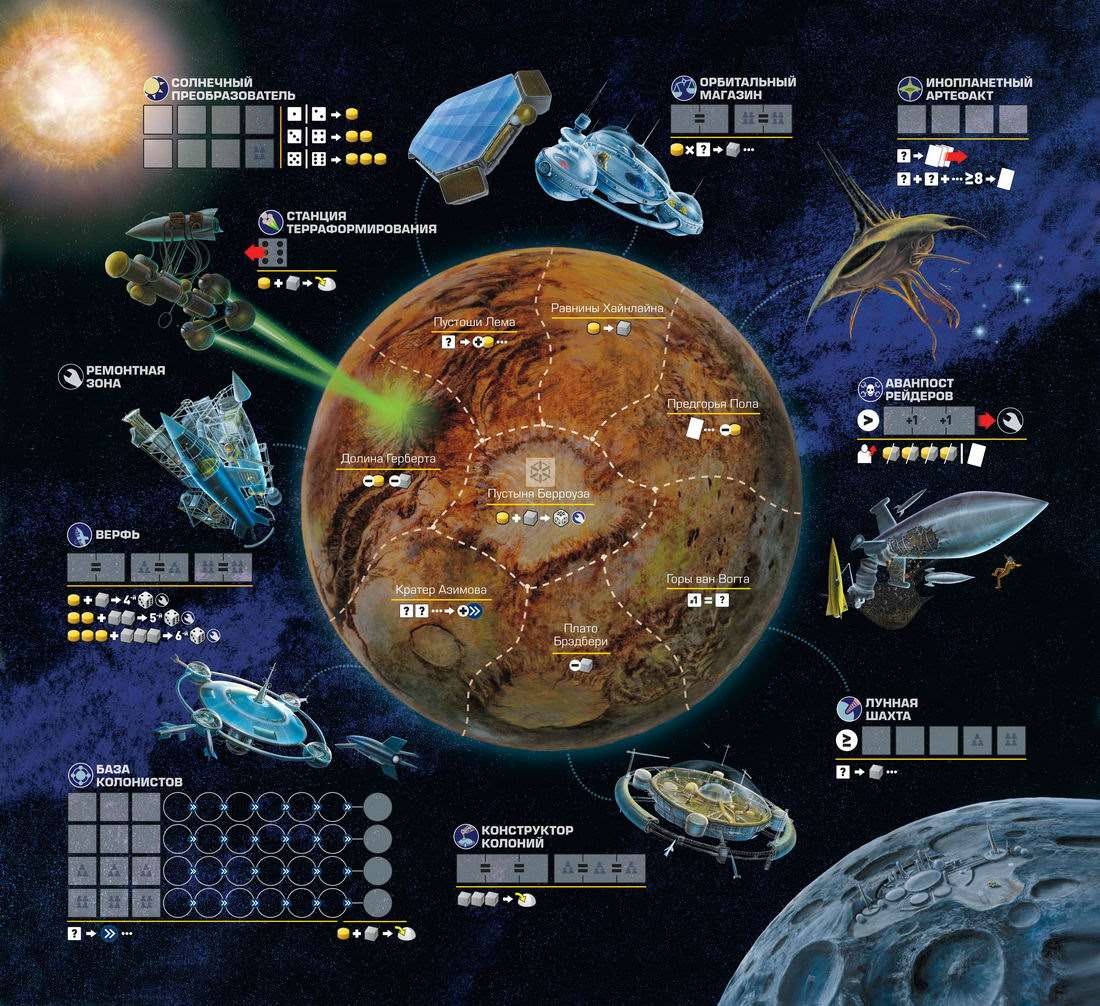 Видобуток ресурсів – руди та сонячної енергії – йде на станціях навколо планети. Однак кількість місць для кораблів там обмежена. До того ж кожен наступний корабель може міститися на локацію тільки зі значенням вищим, ніж вже розташований там корабель-кубик. Тому гравцям не тільки доведеться грамотно розставляти кубики, з огляду на свої випавші значення, але й з оглядкою на куби інших учасників.