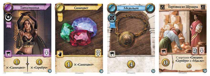По факту це вся гра, але, як відомо, диявол криється в дрібницях і це якнайкраще описує гру. Більшість карт приносять переможні очки або самостійно, або в комбінації з іншими. Однак деякі карти дозволяють обзавестися унікальними предметами з ринку або палацу, що нехай відразу і не принесе багато очок, але в майбутньому дозволять отримати колосальну перевагу. Також є карти націй, що дають різні бонуси як по ходу, так і в кінці гри.