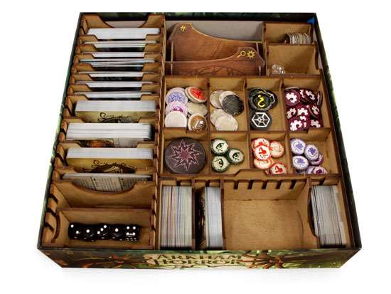 Жах Аркхема Третє Видання). Чудове перевидання вже класичної гри може похвалитися горою компонентів - фішки, токени, тайли, карти, кубики. Все це перед початком гри потрібно ретельно відсортувати і розкласти навколо поля в досяжності всіх гравців, або, що набагато краще - придбати органайзер.