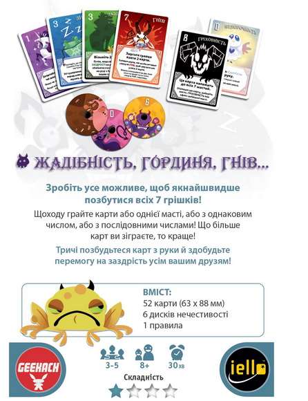 Всім відомо, що є сім гріхів і бажано не піддаватися жодному з них. Ось і вам доведеться добре постаратися, щоб стати єдиним, хто очистився в кінці партії!Тип: карткова, сімейна, для підлітків