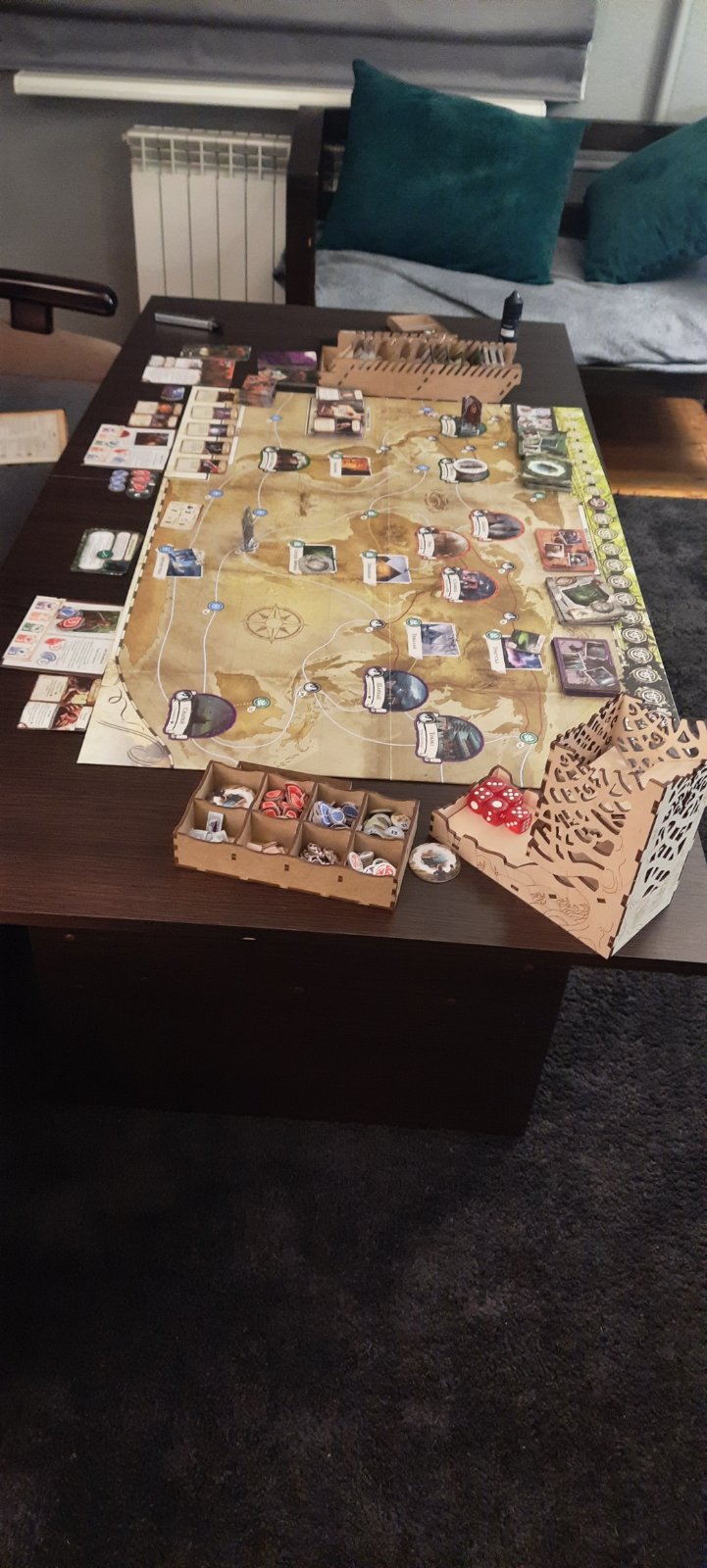 Нема великого органайзера(нажаль у країни агресора є) який буде зберігати усі доповнення. Бо коли у вас вже база та 4-5 доповнень потрібен великий стол щоб усе розмістити на столі. А так вам буде достатньо 2 органайзери та коробку з одного малого доповнення щоб там зберігалися картки міту, зустрічей у внутрешніх локацій та елементи сценаріїв.