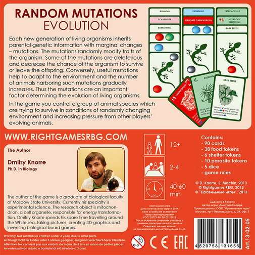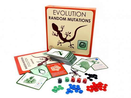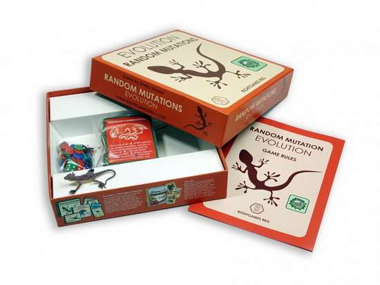 Evolution: Random mutation гравці намагатимуться вивести найжиттєздатніші види живих організмів. Для цього вам доведеться не лише конкурувати з видами опонентів за харчову базу, а і протистояти зовнішнім факторам: паразитам і негативним мутаціям. Кожен хід ви будете розігрувати випадкові карти, створюючи нові види, додаючи їх властивості чи збільшуючи популяцію видів, які вже сформувалися. Причому властивості, які ви зобов'язані розіграти на своїх тваринах, можуть виявитися як корисними, так і негативними. Також кожен раунд кидки кубиків будуть визначати клімат зовнішнього середовища, який ввпливає на наявність корму, прихистків і паразитів. В результаті всі тварини, яким не вистачить харчу, загинуть. Крім цього, поголів'я вашого виду можуть суттєво скоротити хижаки опонентів, паразити і негативні випадкові мутації. Докажіть, що створений вами вид найживучіший, і приведіть його до світового домінування!
