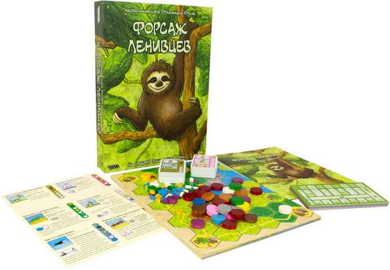 Форсаж лінивців – це сімейна настільна гра, в якій учасники мають навчитися планувати маршрути, щоб доставити вантаж (жетон лінивця) з точки А в точку Б, по дорозі ласуючи листям в різних зустрінутих на ігровому полі лісах.
