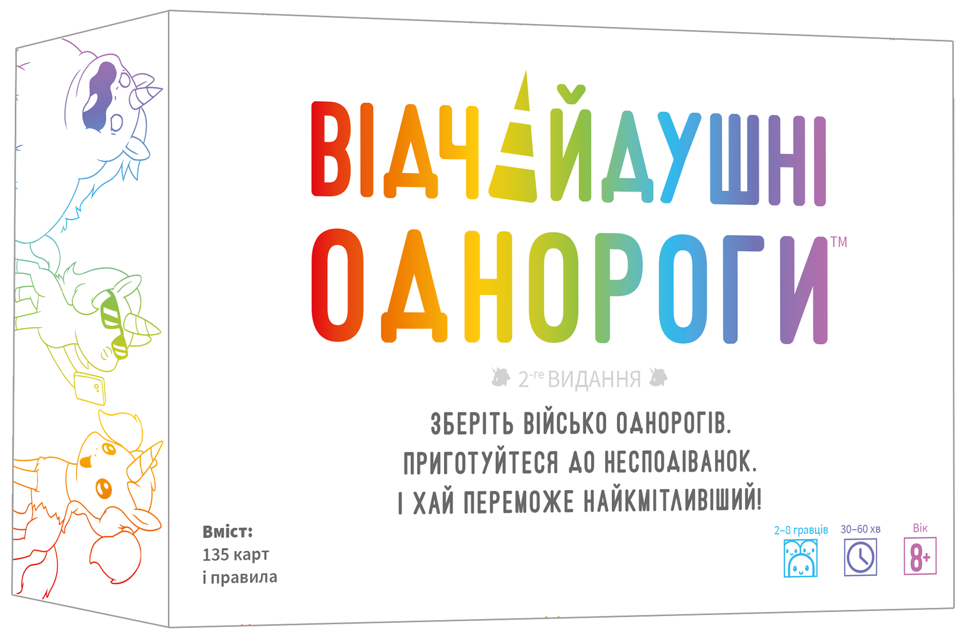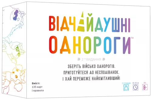 Відчайдушні однороги (Unstable Unicorns) – це блискавичний картковий патігейм на збір сетів для 2-8 гравців, створений спеціально для тих людей, які не можуть жити без двох речей: однорогів і руйнувань, а також страх як не люблять хитромудрі правила, що псують всі веселощі. Якщо це саме те, що вам треба, то вітаємо – ви отримуєте в особисте користування власну стайню та спеціальну бойову задачу: за будь-яку ціну зібрати загін із семи шалених однорогів та знищити кожного негідника, що стане на вашому шляху. Розчохлюйте базуки, діставайте дискобомби, готуйте заклинання – ніхто не встоїть перед цією вбивчою милотою!