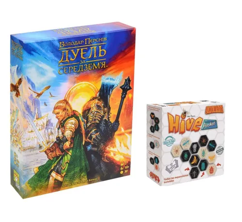 Комплект ігор «Володар Перснів. Дуель за Середземʼя + Вулик» поєднує дві дуельні стратегії, у яких вирішальну роль відіграють продумані ходи та постійний тиск на суперника. Це набір для тих, хто цінує інтелектуальне протистояння — від епічних сюжетних баталій до абстрактної шахоподібної боротьби.