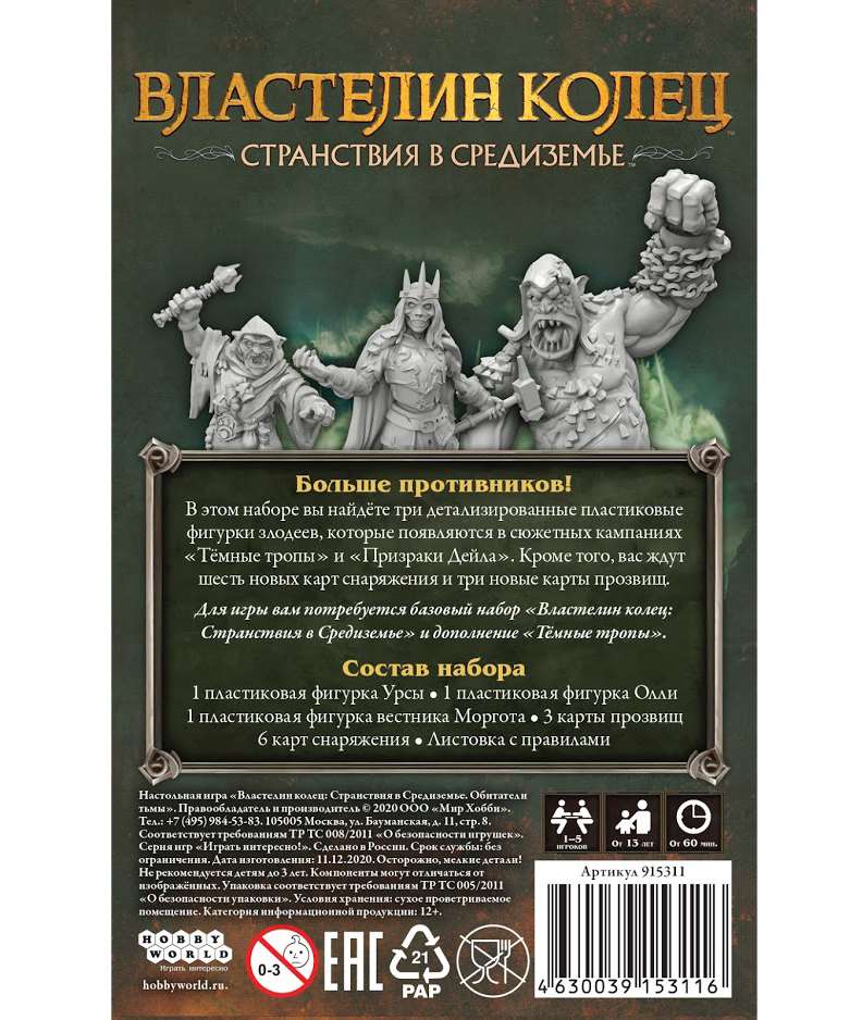 Мешканці темряви – це невелике доповнення до настільної гри Володар перснів: Мандри в Середзем'ї, яке допоможе вам оживити трьох істот темряви. Можливо, ви їх зустрінете під час проходження кампаній Темні стежки та Примари Дейла.
