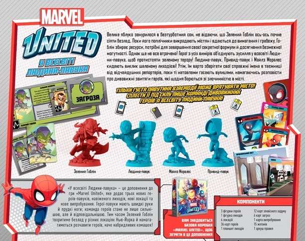 Злісний негідник Зелений Гоблін знову увірвався в Нью Йорк, виношуючи підступні задуми про поневолення жителів і жагу необмеженої влади! Але що це? Он з даху будинку зістрибнула фігурка людини. З його руки стрімко вирвалася срібна нитка, і, зачепившись за карниз та зробивши запаморочливий пірует, Людина-павук увірвався в гущу поплічників Зеленого Гобліна!Тип: доповнення до настільної гри «Marvel United: Українське видання»